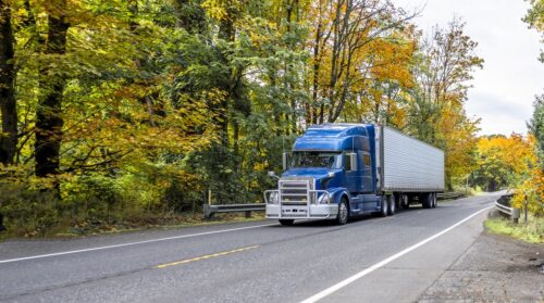 Classic American bonnet blue big rig industrial semi truck transporting commercial cargo in refrigerator semi trailer running on mountain road with autumn trees on the sides in Columbia Gorge area