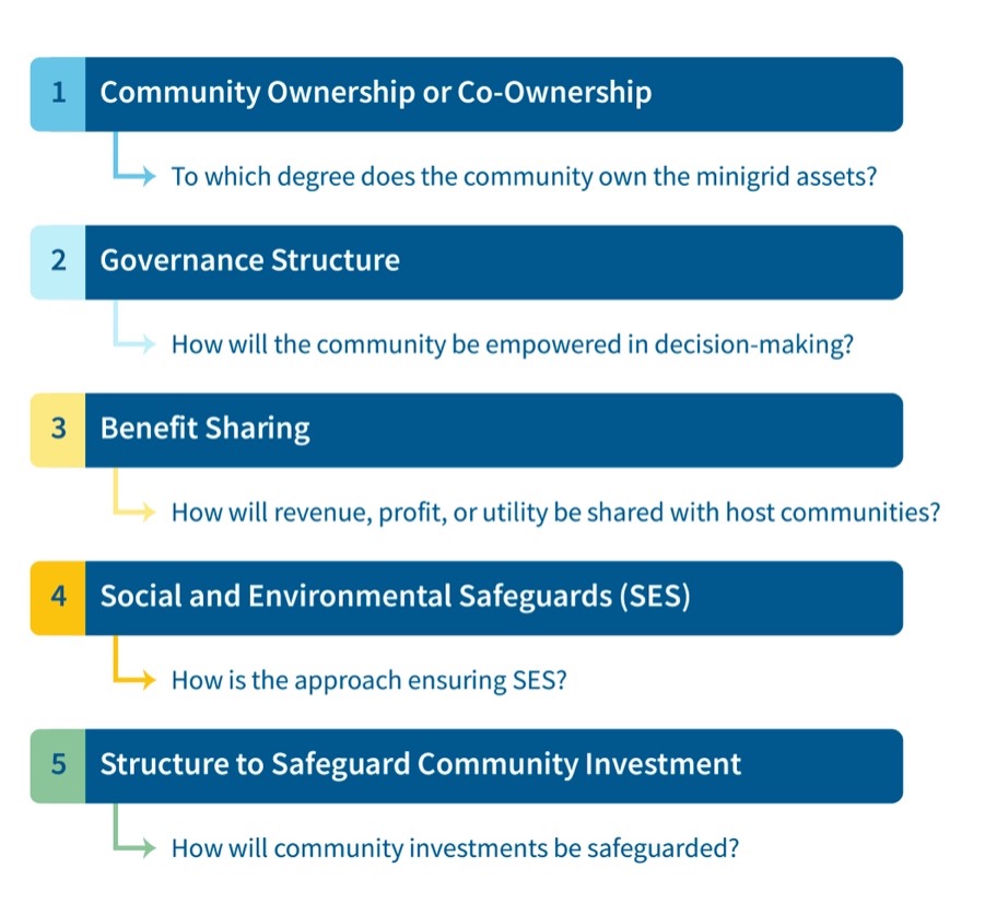 The approach is built on five key aspects with the overarching goal to better serve community needs, priorities, and context. They are not prescriptive and highly flexible. Minigrid practitioners can adopt and tailor them in part or in full, based on community relationship, feasibility, and project goals.