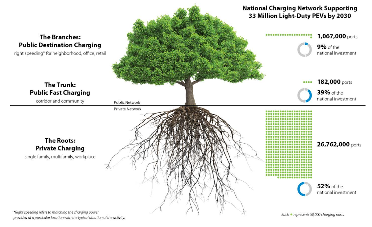 Refueling is most cost-effective and convenient when it happens where people are already spending their time — at home or work — and this is where the majority of EV charging investment should flow. This concept has been described as a tree, with at-home and workplace charging acting as the sustaining roots of the system. DC fast charging is and will continue to be the most expensive type of charging a driver can access, but it plays a supporting role. Charging behavior also suggests that fast charging will be the least utilized, as 80% of charging sessions occur at the driver’s home.