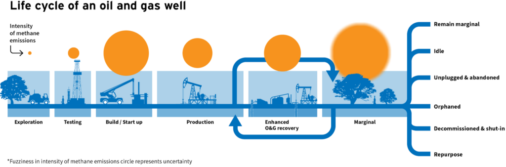 This can have implications for safeguarding local communities and the global climate. The emissions intensity and composition of oil and gas also change over time as an asset moves beyond its production heyday. As a well gets older and production drops, it can become a “marginal well,” producing less than 630 gallons a day while contributing a disproportionate amount to emissions and the subsequent environmental and health risks. Around 75 percent of America’s currently producing wells are marginal wells, but they produce less than 5 percent of oil and gas in the United States. Properly maintaining and decommissioning aging, low-producing assets could yield economic and social benefits.