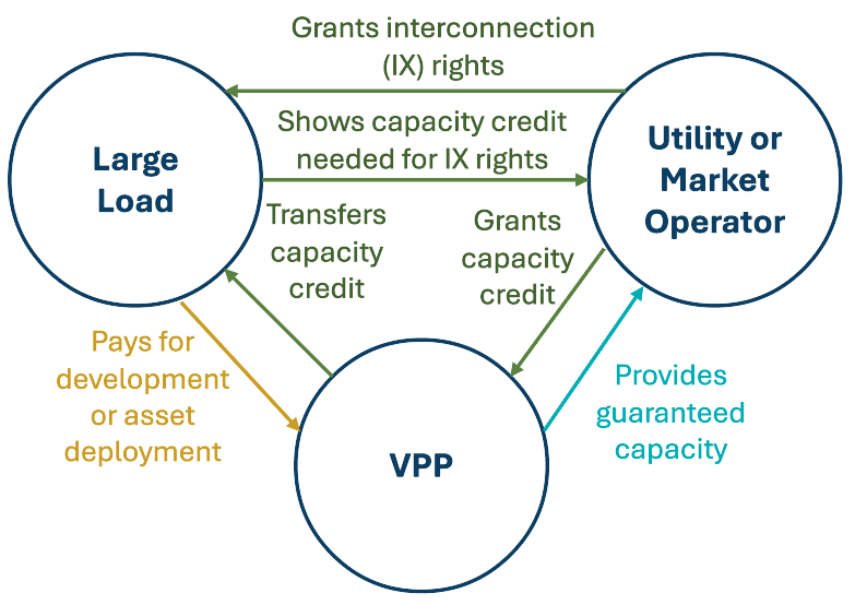 - VPP–utility contract: the VPP guarantees capacity across a certain number of needed hours per year. The utility is responsible for purchasing the required capacity from VPPs that it deems necessary to justify expedited interconnection. The VPP (not the large load) is liable for delivering in accordance with this contract. This is similar to how many VPP aggregator contracts are structured with utilities today.