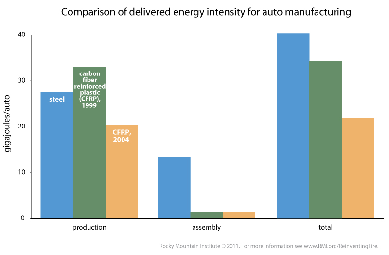 Carbon fiber production is more energy intensive than steel production (by mass). However, because revolutionary autos will require less body mass, there are significant opportunities for energy reduction in the auto manufacturing industry.