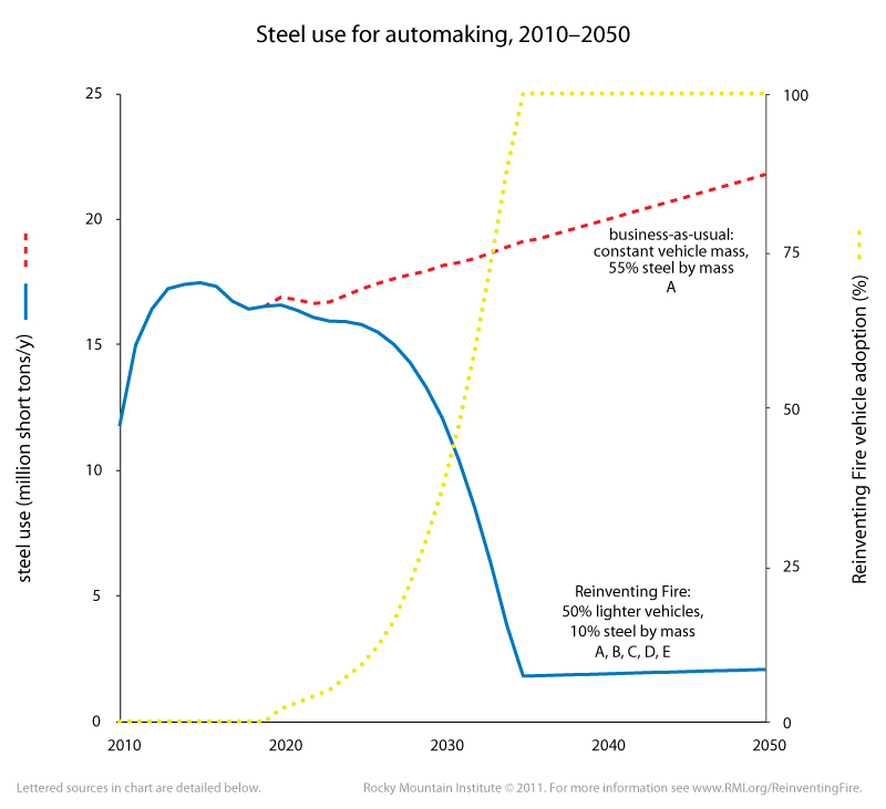 The shift from steel to carbon fiber in the transportation sector reduces steel production. With the rapid adoption of lightweight vehicles, RMI estimates that, in 2050, the auto industry will require one-fifth the steel used in 2010.