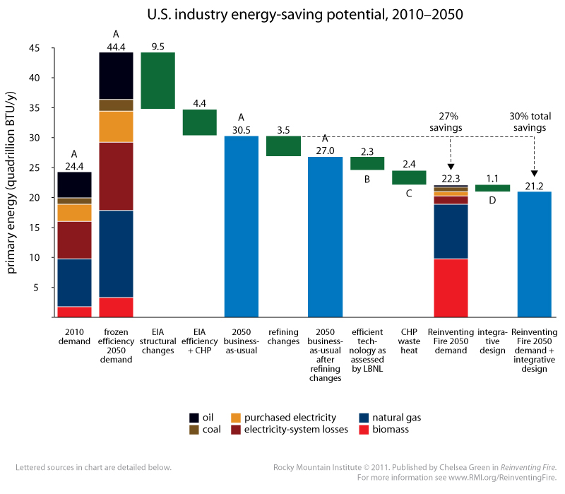 Energy use for U.S. industry is conventionally projected to grow from 24.4 quads in 2010 to 30.5 quads in 2050. In 2010, more than four-fifths of energy use in U.S. industry came from fossil fuels. Natural gas is the dominant source of energy (~35%).