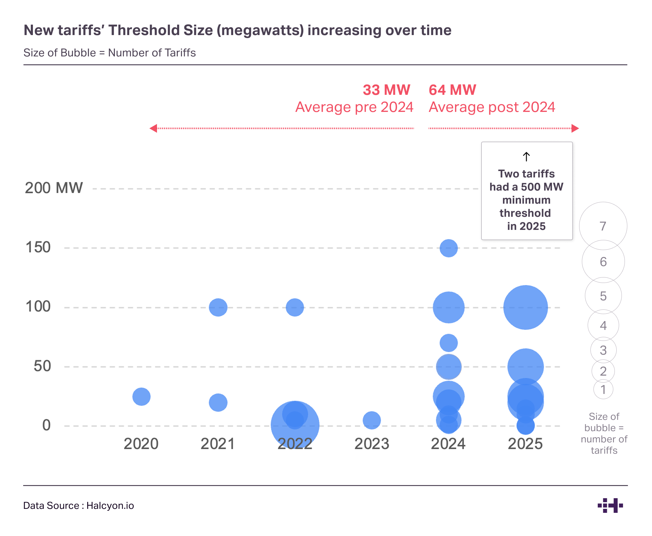The most common way to define eligibility of a large load is by its total capacity in megawatts. As shown in Exhibit 1, over the past few years large load tariffs have begun to more frequently set higher threshold sizes, although the “right” size will likely vary by system. Many large load tariffs that set eligibility by size also include aggregation clauses to prevent customers from splitting a large facility into smaller loads on nearby sites to avoid falling under the tariff. Other criteria that are sometimes used to establish large load tariff eligibility include load factor, power factor, or industry. In some cases, lawmakers will legislate these thresholds themselves or direct utility commissions to set them, as in Utah’s SB132, which defines large loads as those 100 MW or greater, and Minnesota’s HF16, which directs the Public Utilities Commission to establish an appropriate threshold for a new large load rate class.