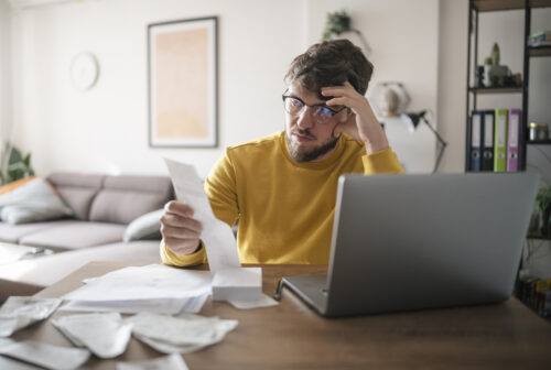 Stressed and helpless man at home worrying about the high bills. Inflation concept