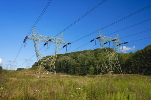 Electric high power lines across a wooded landscape, part of the energy grid in the northeastern USA in Pennsylvania.