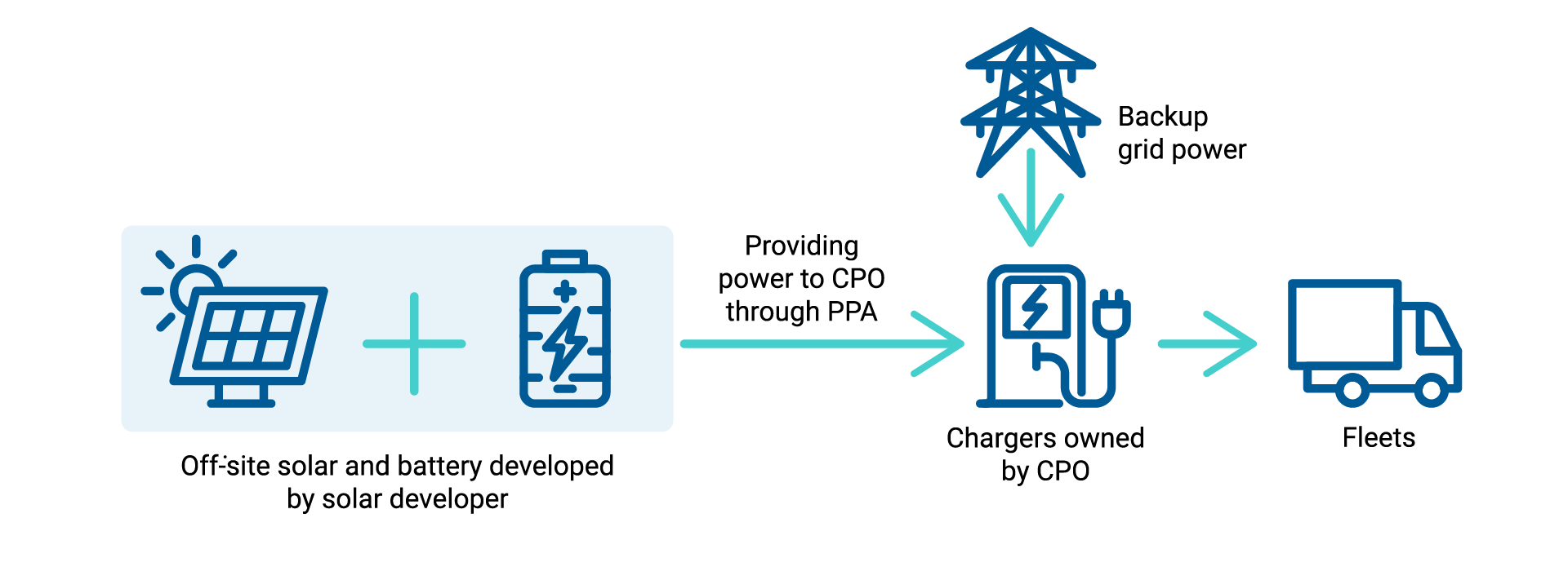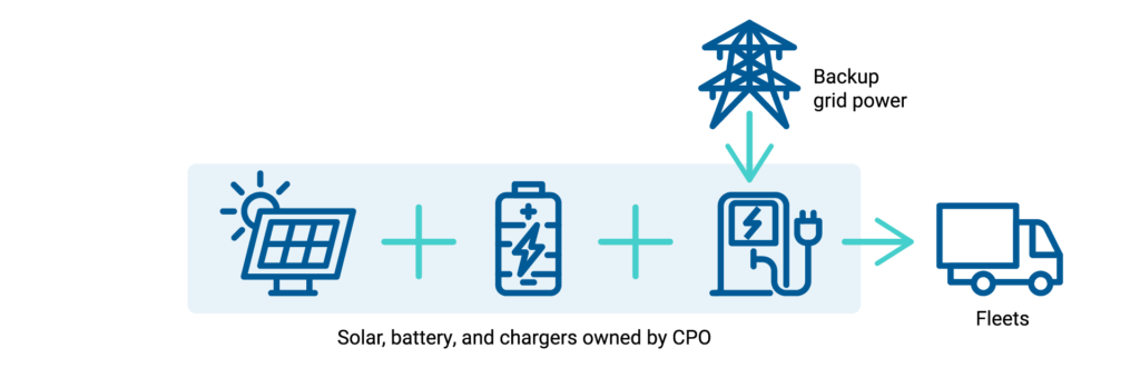 Other options also exist for industrial consumers to source clean electricity, although they may only apply to specific use cases within the logistics sector. For example, a third-party renewable energy developer can install and operate an on-site solar and battery system exclusively for a charging site, with the CPO purchasing electricity from the developer through a PPA. This model suits CPOs that do not want to take on high up-front capital costs. However, the overall cost of operating a solar-based charging station may be higher due to the involvement of a third party. Another option is the group captive model, in which several electricity consumers jointly develop a solar plant to meet their own energy needs. This approach suits stakeholders with available land and significant demand for solar energy, potentially beyond EV charging, such as ports.