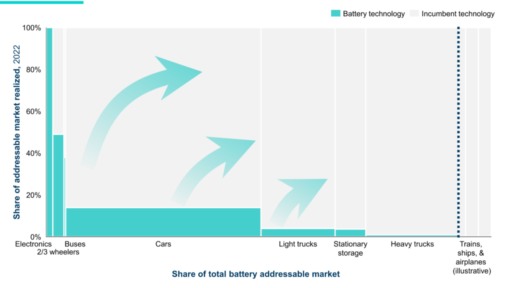 Source: BNEF, RMI analysis; Electronics share of addressable market percentage indicative, transport percentage based on 2022 EV sales share, stationary storage defined as sales volume today divided by peak sales in long term (2050). Trains, ships, and airplane total addressable market sizes illustrative.