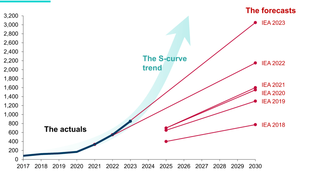 Over the past years, many battery forecasts have effectively projected linear growth. As Exhibit 4 illustrates, actual sales keep outrunning such forecasts and as a result analysts keep revising their projections upward. The caution of such linear thinking may, on the surface, seem reasonable, but in reality, it is simply wrong.