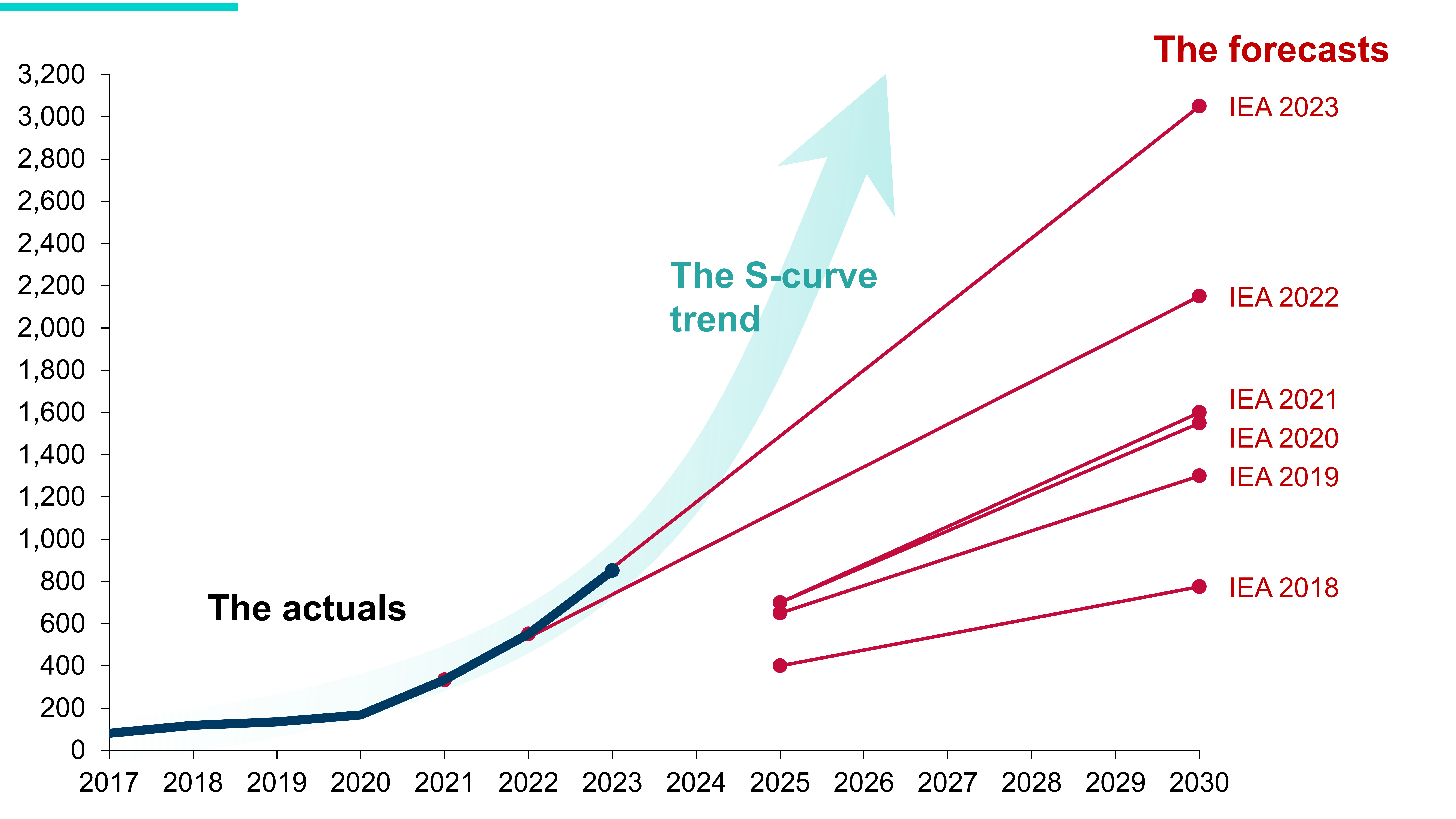Exhibit 4: Automotive lithium-ion battery demand, IEA forecast vs. actuals, GWh/y