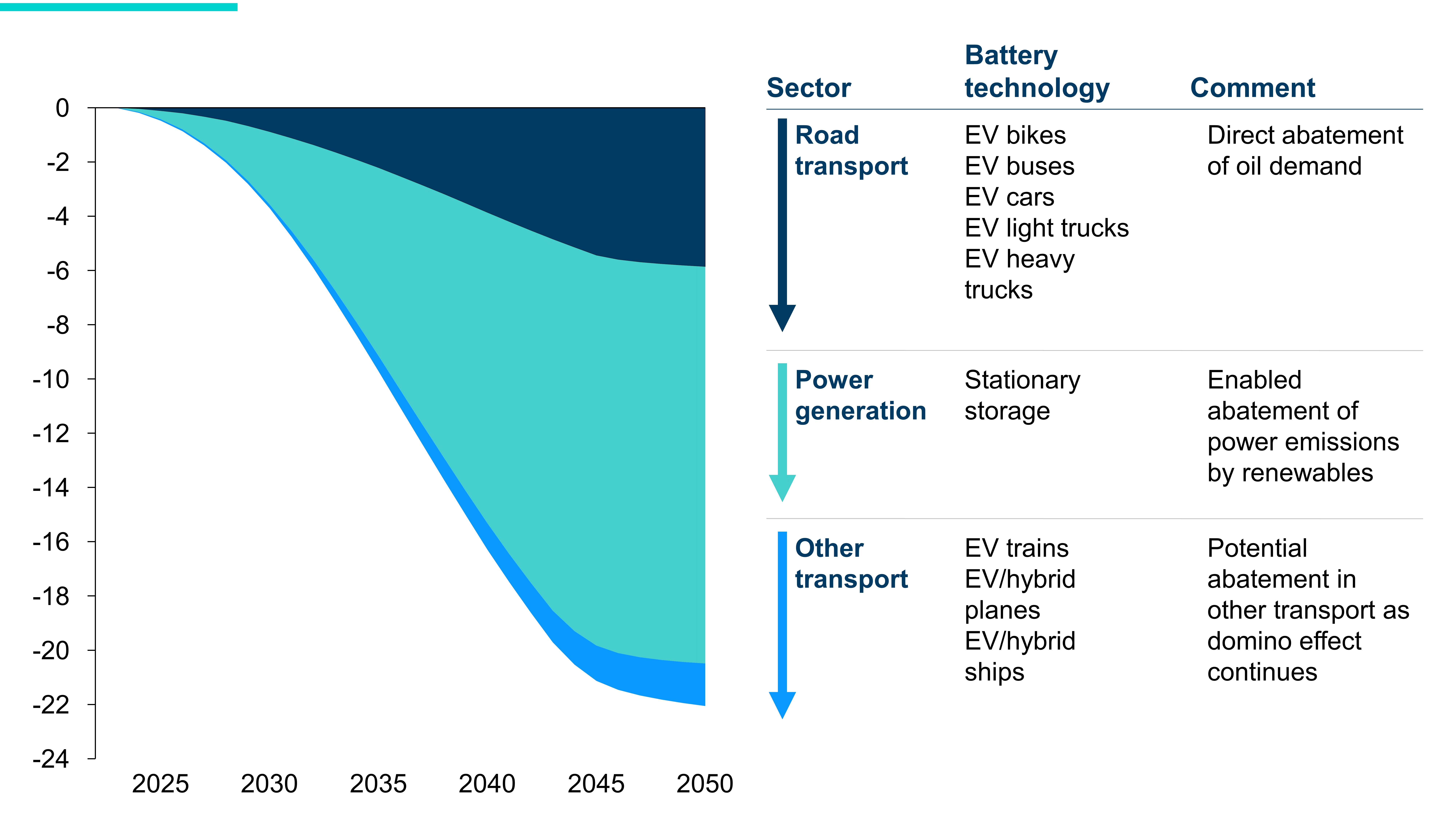 Exhibit 6: CO2 emissions abatement enabled by batteries, GtCO2/y abatement versus emissions today