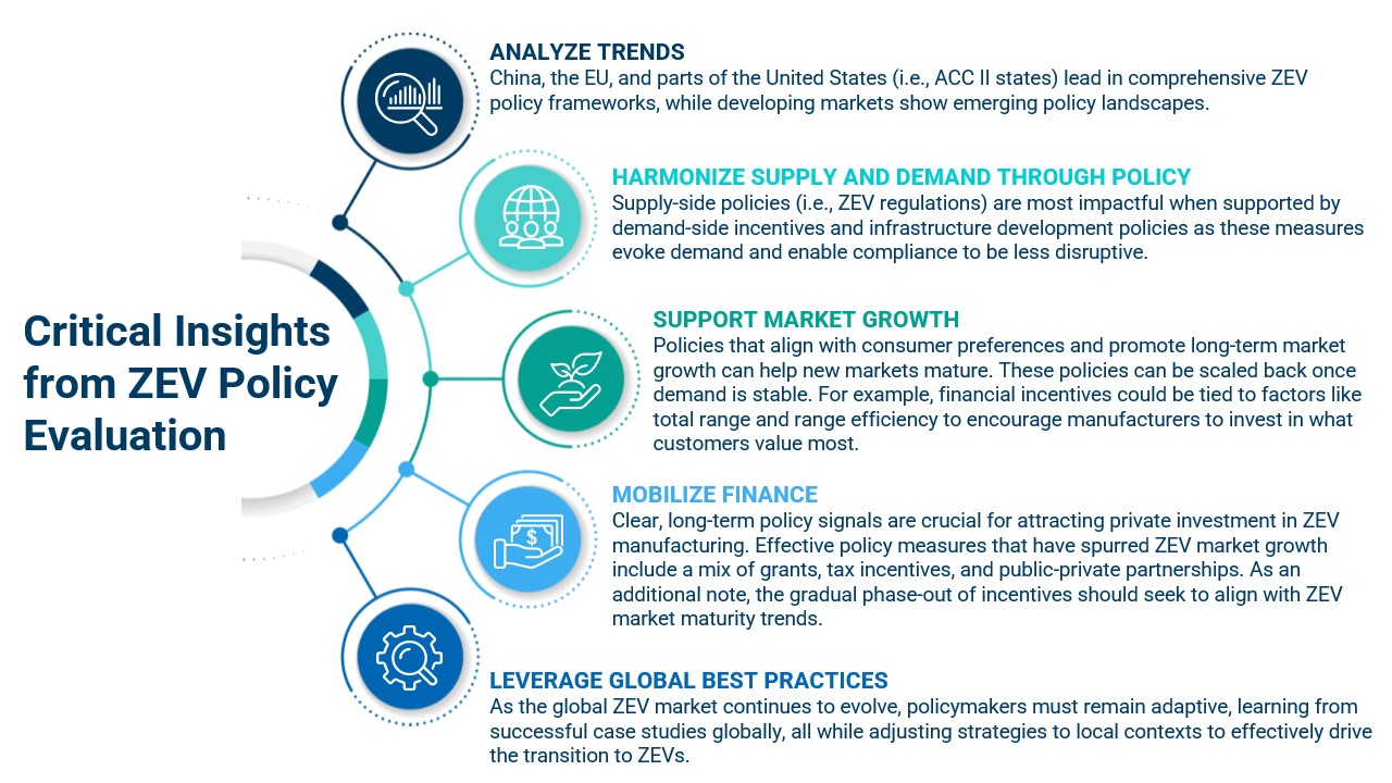 Supply-side policies have an important role to play in advancing the ZEV transition. When considering ZEV supply-side policies, decision makers should leverage global lessons learned and analyze trends to understand what policies have positively impacted other markets. While policies are not always transferable from one market to another, there are several key takeaways that can be leveraged and customized to enable local market growth.