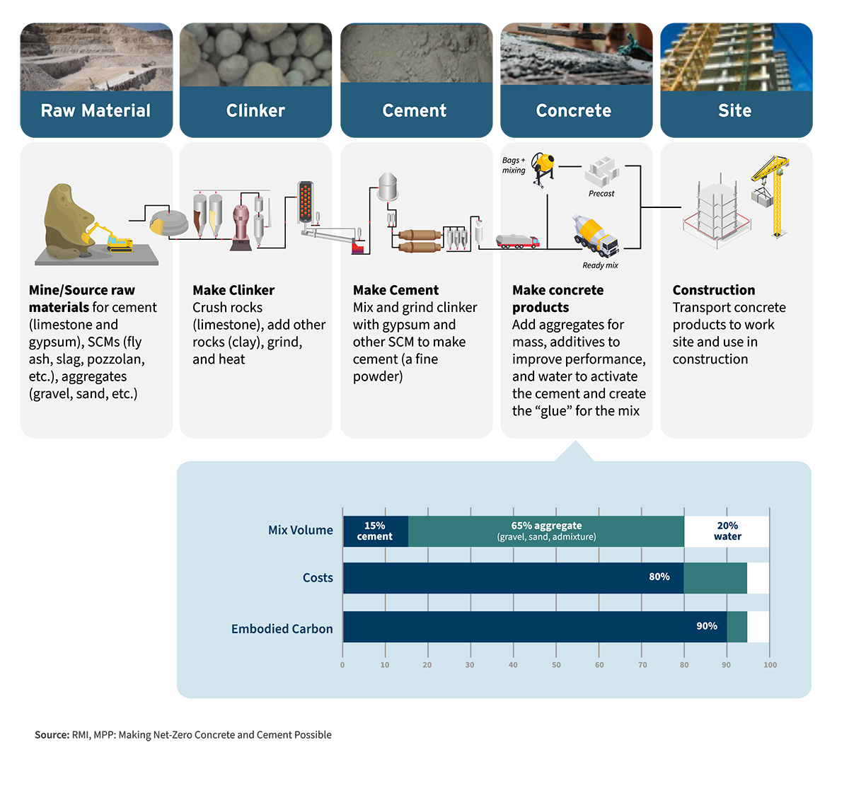 Concrete’s global scale and the highly local nature of its production both shape the decarbonization challenge. While cement is often exported internationally, concrete is made close to where it will be used. Concrete is heavy and starts to harden as soon as it is mixed, making it impractical to transport over long distances. Production and consumption are therefore closely tied to local demand, available materials, and policy environments, creating highly regionalized markets that require locally tailored solutions.