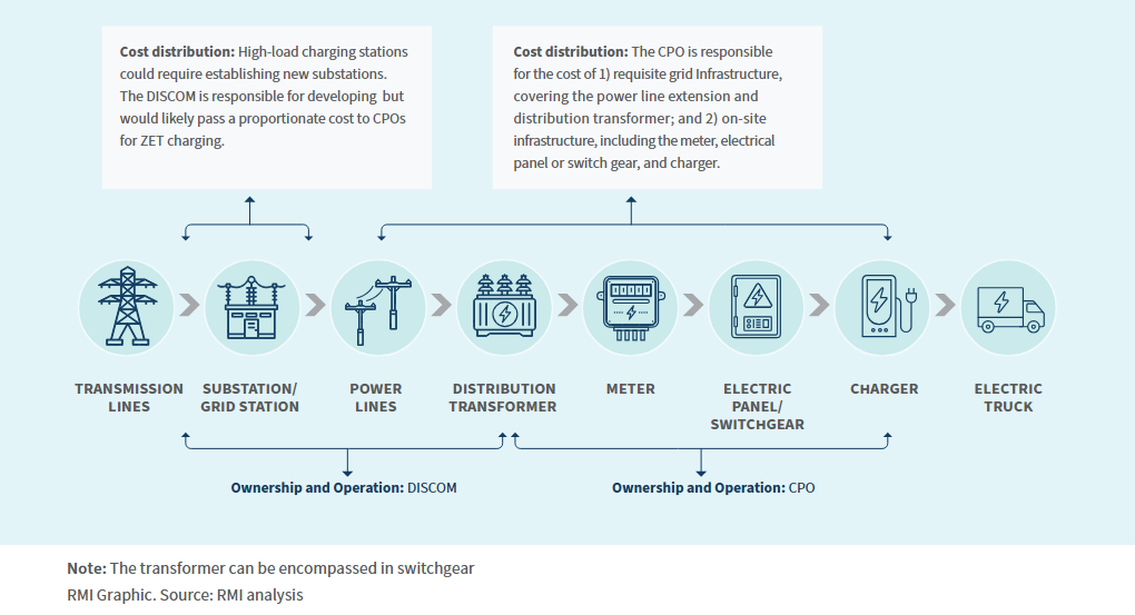 Broadly speaking, DISCOMs are responsible for owning and operating front-of-the-meter grid infrastructure including substations and power lines, while CPOs invest in the chargers and on-site electrical equipment such as switchgear. However, in practice, the actual division of costs between DISCOMs and CPOs can vary from project to project, depending on the specific terms of their agreement. For example, a DISCOM may own and operate the transformer, but the associated costs could be shared with the CPO.