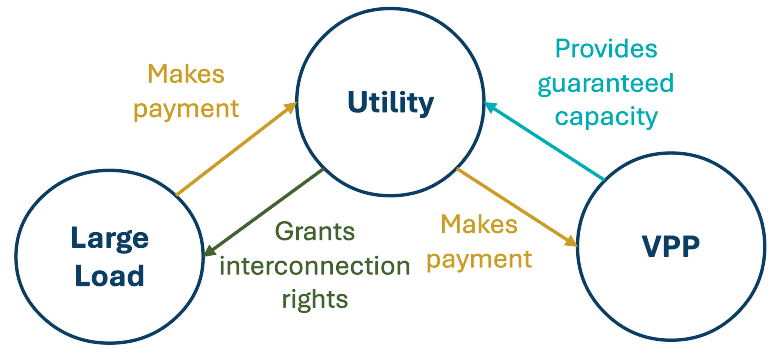 - VPP–utility contract: the VPP guarantees capacity across a certain number of needed hours per year. The utility is responsible for purchasing the required capacity from VPPs that it deems necessary to justify expedited interconnection. The VPP (not the large load) is liable for delivering in accordance with this contract. This is similar to how many VPP aggregator contracts are structured with utilities today.