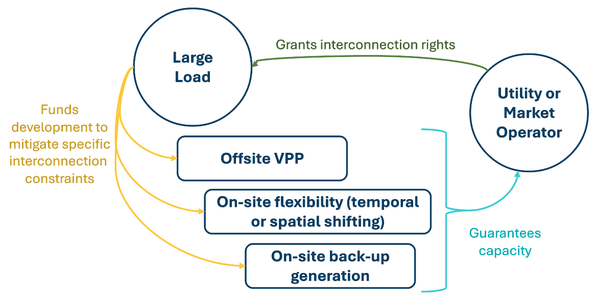 - Large load–utility contract: The large load and the utility or market operator enter into an agreement by which capacity credits can be exchanged for expedited interconnection.