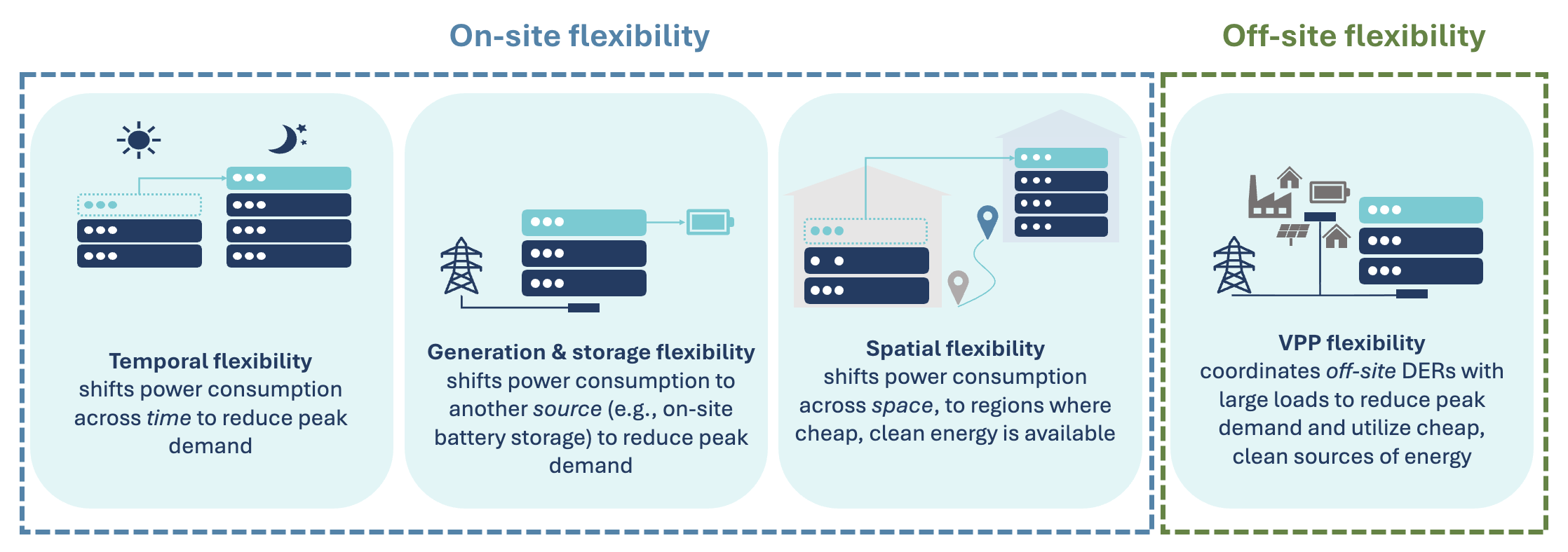 VPPs can either complement or provide the same function as on-site flexibility — shifting loads of the data center itself. Research and commercial activity have started to demonstrate that it’s technically feasible and valuable to build data centers with on-site flexibility in mind. However, it may still benefit data center owners to complement on-site flexibility with VPPs, especially in cases with technical challenges or high opportunity costs associated with curtailing or flexing data center demand.