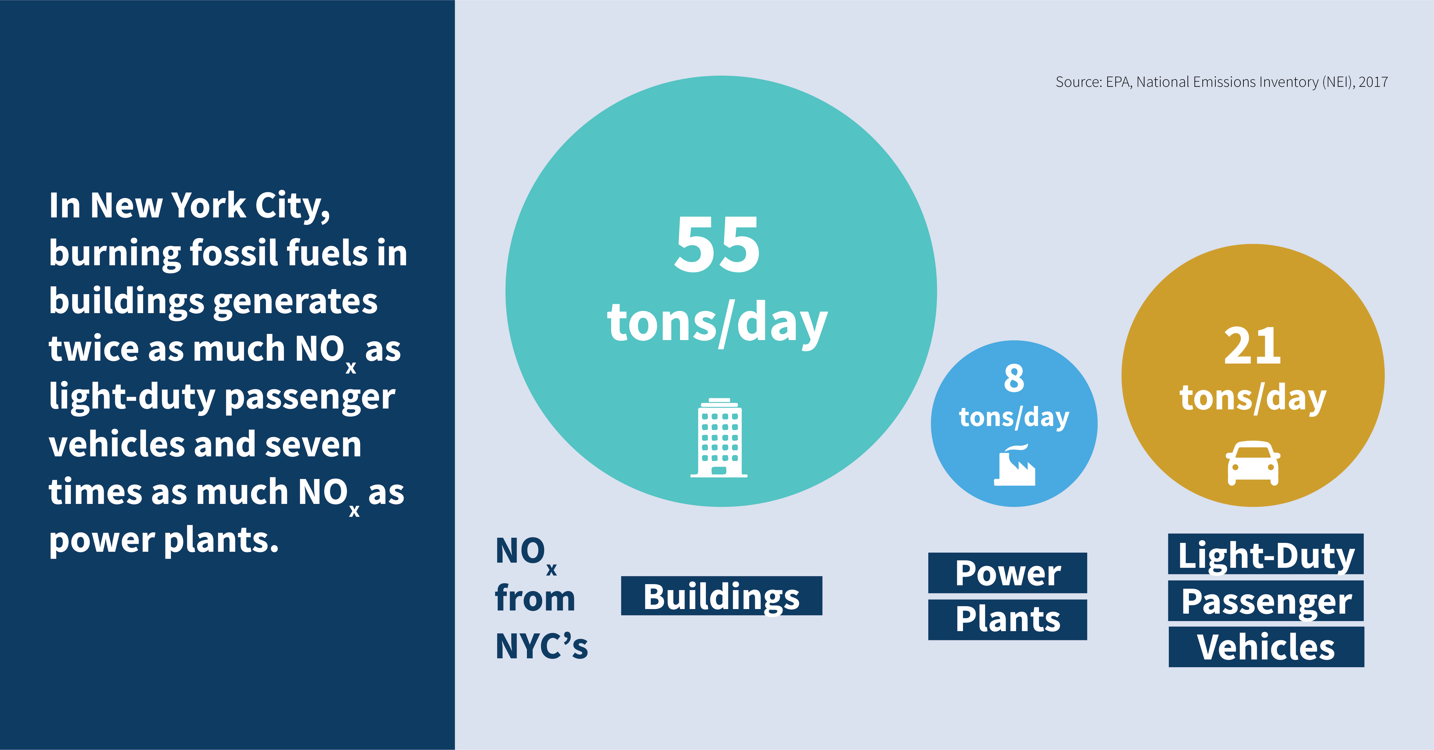 New York is also the worst offender in the country when it comes to NOx emissions from residential and commercial buildings—a distinction driven primarily by combustion emissions in New York City buildings. NOx emissions are harmful on their own, but they also lead to secondary PM2.5 formation and react with atmospheric compounds to create ozone, the primary ingredient in smog.