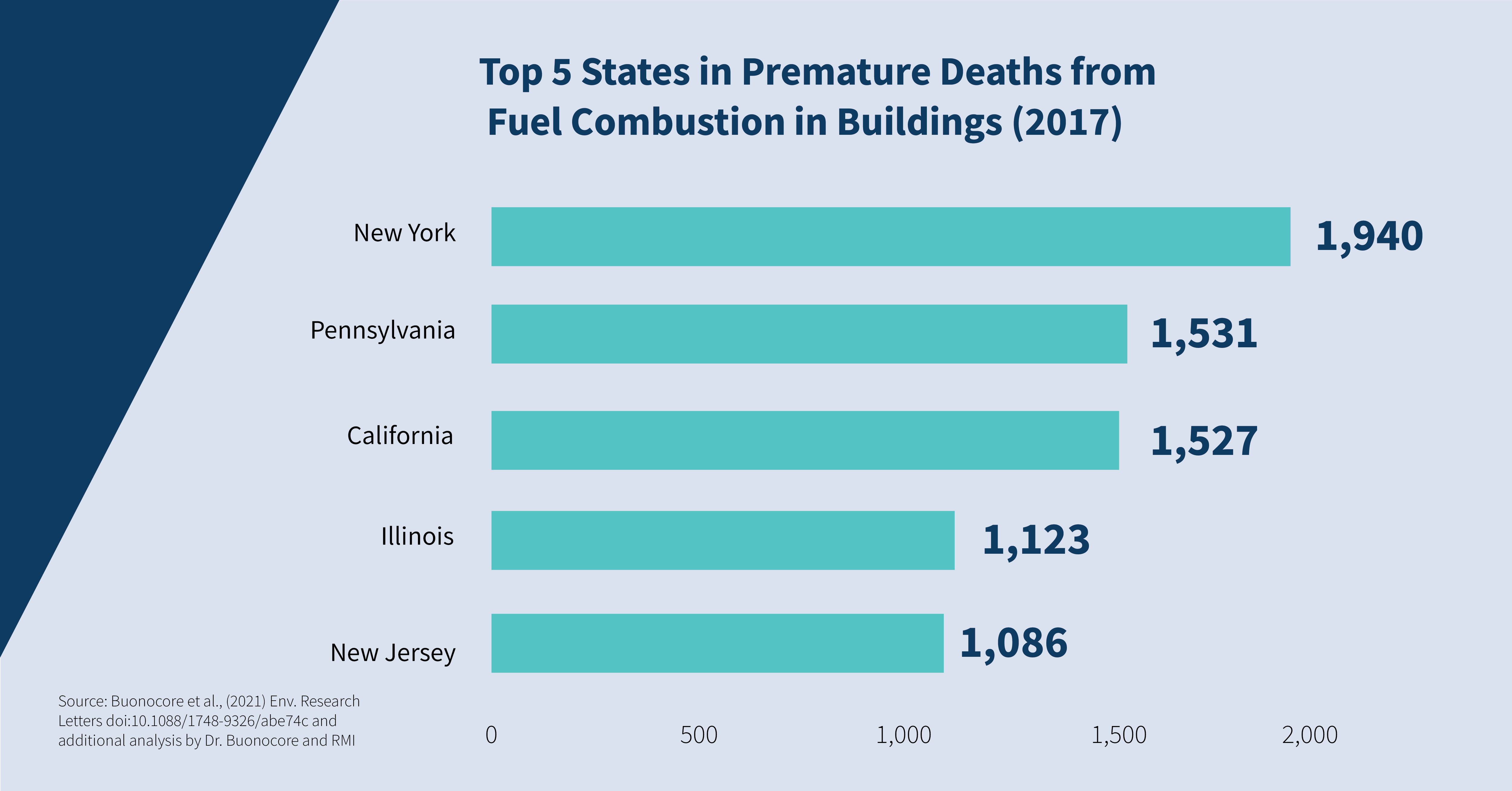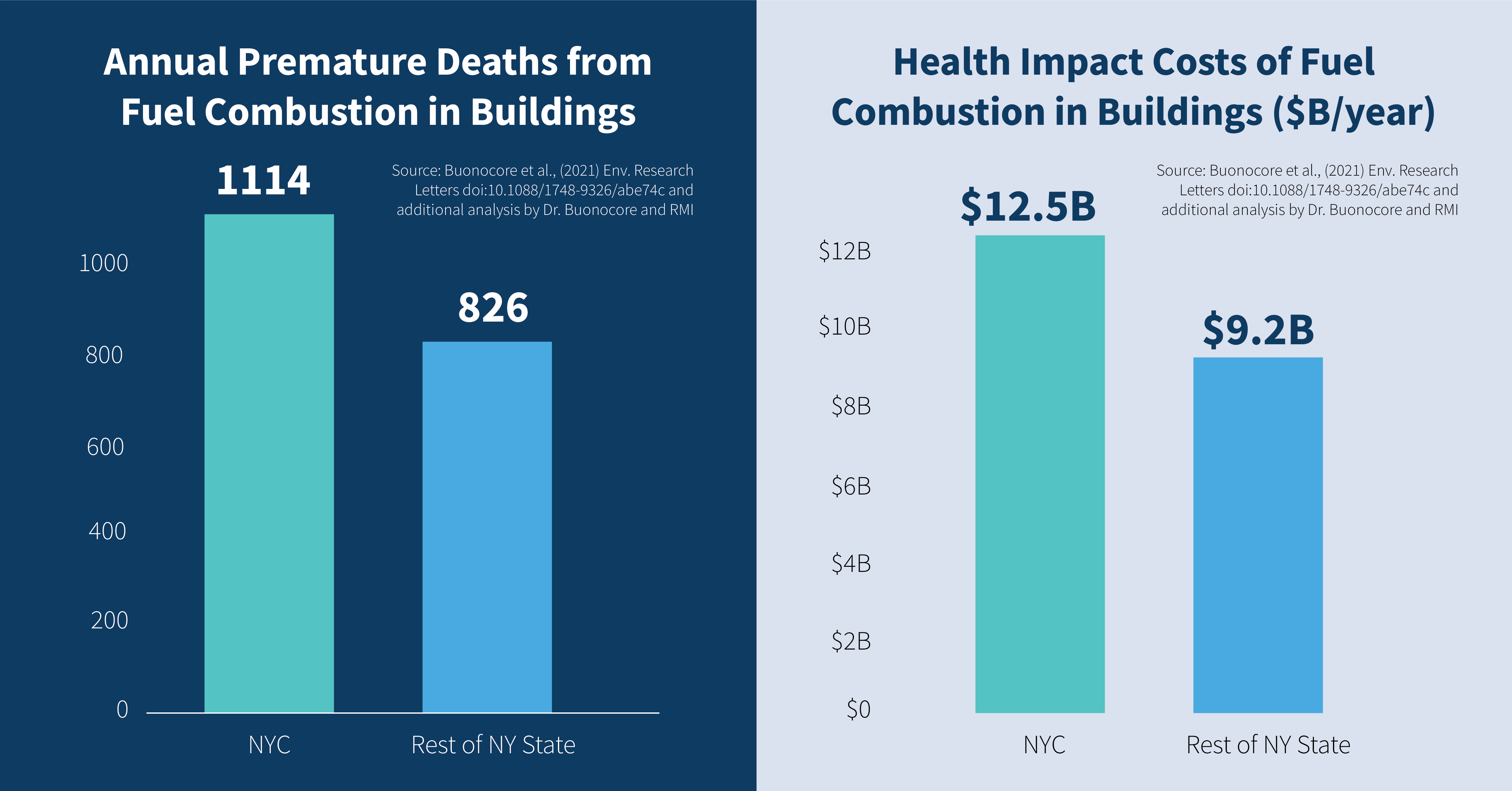 A new study released this month, titled “A Decade of the U.S. Energy Mix Transitioning Away from Coal: Historical Reconstruction of the Reductions in the Public Health Burden of Energy,” found that pollution from fuel combustion in residential and commercial buildings in New York led to an estimated 1,940 premature deaths and totaled $21.7 billion in health impacts in 2017 (the most recent available data). Based on this data, New York tops the list in terms of premature deaths and health impacts from fuel combustion in buildings, followed by Pennsylvania, California, Illinois, and New Jersey. Additional analysis from Jonathan Buonocore, Sc.D., the study’s lead author, and RMI, found that New York City accounted for the majority of these impacts, with 1,114 premature deaths and $12.5 billion in health impact costs, compared to 826 premature deaths and $9.2 billion in the rest of the state combined.