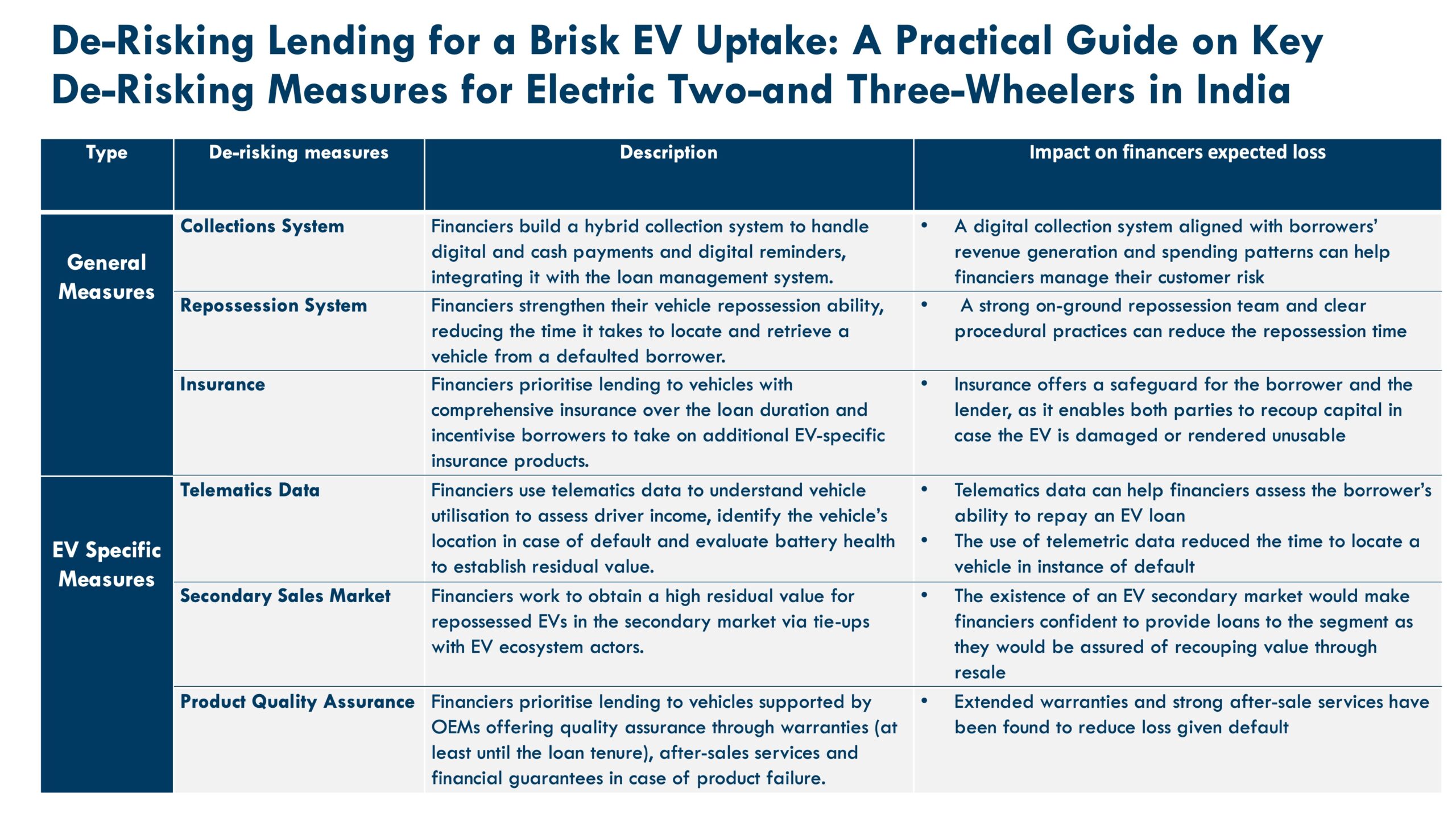2. Derisking measures can effectively distribute liability and build market confidence, creating a stable and favorable investment environment. These can be 1) measures commonly adopted across financial sectors tailored to the EV sector and 2) measures specific to the e-2/3W industry. The table below presents six derisking measures, elaborated in detail in RMI’s latest report in collaboration with NITI Aayog and SIDBI, Derisking Lending for a Brisk EV Uptake.