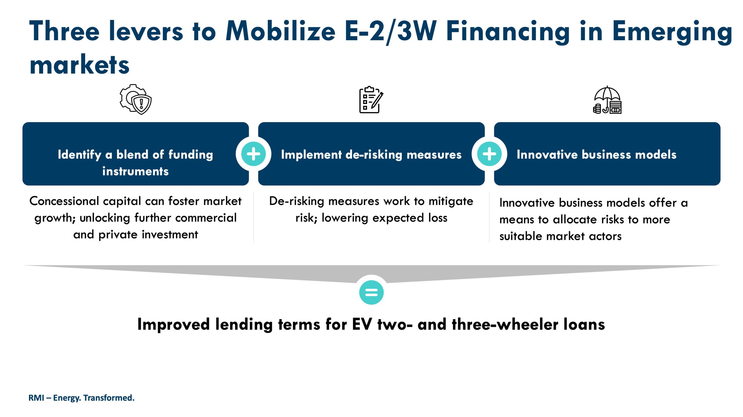 To reduce and manage e-2/3W lending risks, public and private stakeholders within the e-2/3W ecosystem should work collectively to identify how financial instruments, risk reduction measures, and strategic business models can work to mobilize financing and better manage market risks.